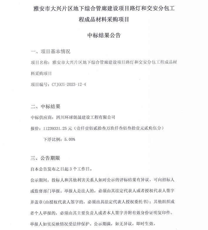 雅安市大興片區(qū)地下綜合管廊建設(shè)項(xiàng)目路燈和交安分包工程成品材料采購(gòu)項(xiàng)目中標(biāo)結(jié)果公告