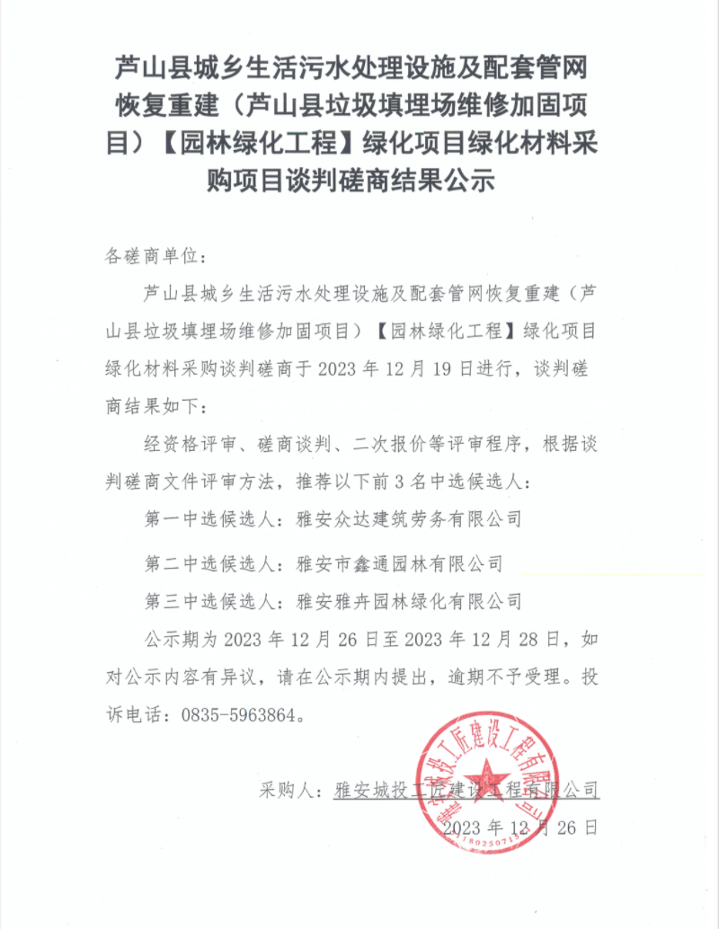 蘆山縣城鄉(xiāng)生活污水處理設施及配套管網恢復重建(蘆山縣垃圾填埋場維修加固項目)【園林綠化工程】綠化項目綠化材料采購項目談判磋商結果公示