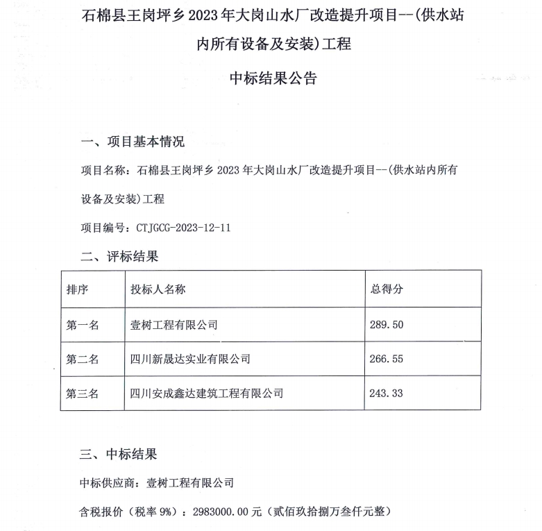 石棉縣王崗坪鄉(xiāng)2023年大崗山水廠改造提升項目--(供水站內(nèi)所有設(shè)備及安裝)工程中標(biāo)結(jié)果公告