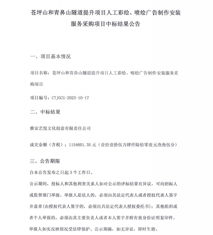 蒼坪山和青鼻山隧道提升項目人工彩繪、噴繪廣告制作安裝服務(wù)采購項目中標結(jié)果公告