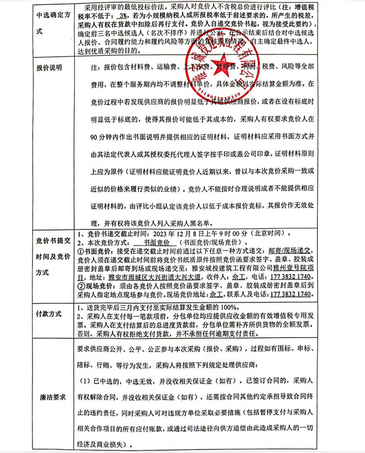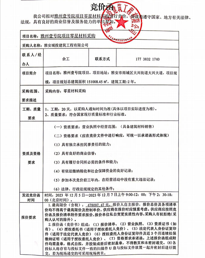 雅州壹號院項(xiàng)目零星材料采購競價(jià)公告