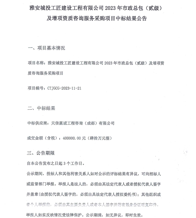 雅安城投工匠建設(shè)工程有限公司2023年市政總包(貳級(jí))及增項(xiàng)資質(zhì)咨詢服務(wù)采購(gòu)項(xiàng)目中標(biāo)結(jié)果公告