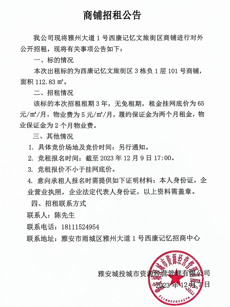 雅州大道1號西康記憶文旅街區(qū)3棟負(fù)1層101號商鋪招租公告