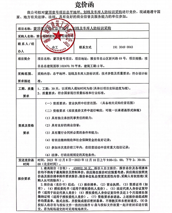 蒙頂壹號(hào)項(xiàng)目總平地坪、劃線及車(chē)庫(kù)人防標(biāo)識(shí)采購(gòu)競(jìng)價(jià)公告