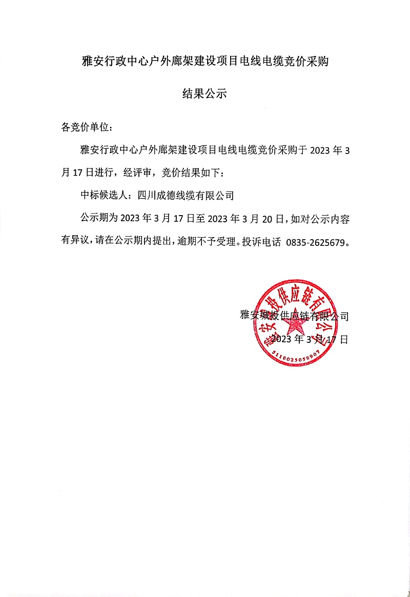 雅安行政中心戶外廊架建設(shè)項(xiàng)目電線電纜競價采購結(jié)果公示