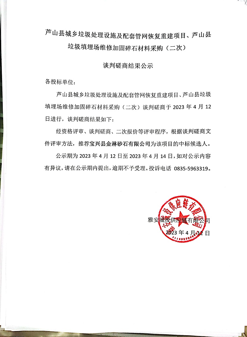 蘆山縣城鄉(xiāng)垃圾處理設施及配套管網(wǎng)恢復重建項目、蘆山縣垃圾填埋場維修加固碎石材料采購(二次)談判磋商結(jié)果公示