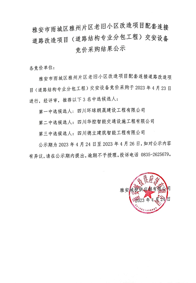 雅安市雨城區(qū)雅州片區(qū)老舊小區(qū)改造項目配套連接道路改造項目(道路結(jié)構(gòu)專業(yè)分包工程)交安設(shè)備競價采購結(jié)果公示