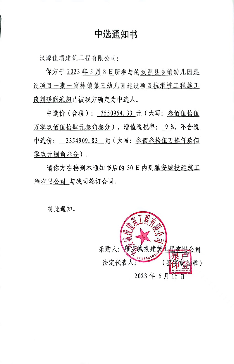 漢源縣鄉(xiāng)鎮(zhèn)幼兒園建設(shè)項(xiàng)目一期一富林鎮(zhèn)第三幼兒園建設(shè)項(xiàng)目抗滑樁工程施工談判磋商采購(gòu)中選通知書(shū)