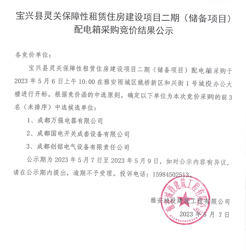 寶興縣靈關(guān)保障性租賃住房建設(shè)項(xiàng)目二期(儲(chǔ)備項(xiàng)目)配電箱采購競(jìng)價(jià)結(jié)果公示