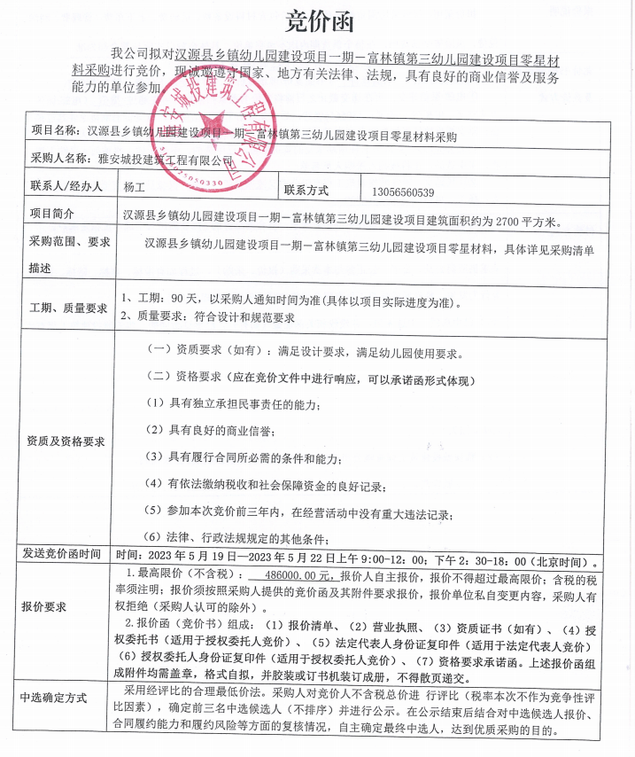 漢源縣鄉(xiāng)鎮(zhèn)幼兒園建設(shè)項目一期一富林鎮(zhèn)第三幼兒園建設(shè)項目零星材料采購競價公告