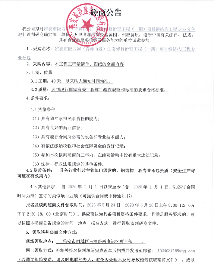 雅安市隴西河(青鼻山段)生態(tài)修復治理工程(一期)項目鋼結(jié)構(gòu)工程專業(yè)分包談判磋商公告