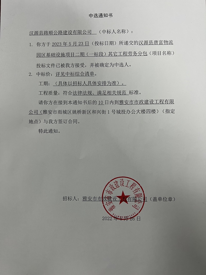 漢源縣唐富物流園區(qū)基礎(chǔ)設(shè)施項(xiàng)目二期(一標(biāo)段)其它工程勞務(wù)分包中選通知書