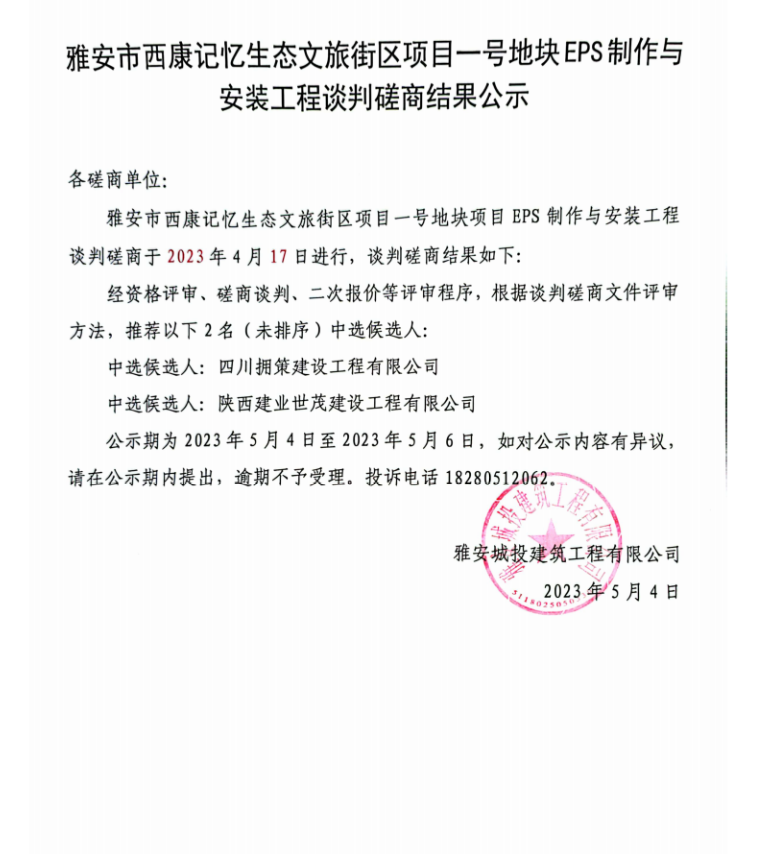 雅安市西康記憶生態(tài)文旅雅安市西康記憶生態(tài)文旅街區(qū)項目一號地塊EPS制作與安裝工程談判磋商結(jié)果公示