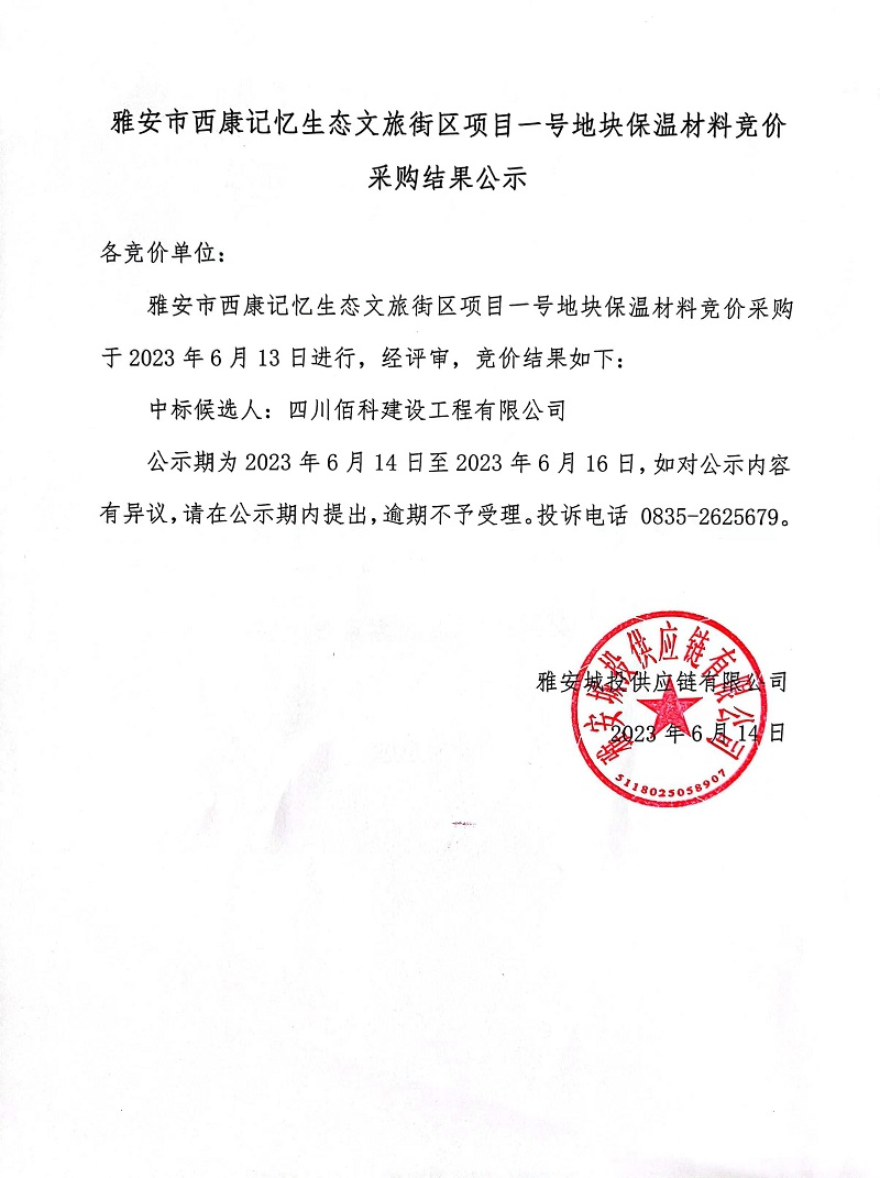 雅安市西康記憶生態(tài)文旅街區(qū)項(xiàng)目一號(hào)地塊保溫材料采購競價(jià)采購結(jié)果公示