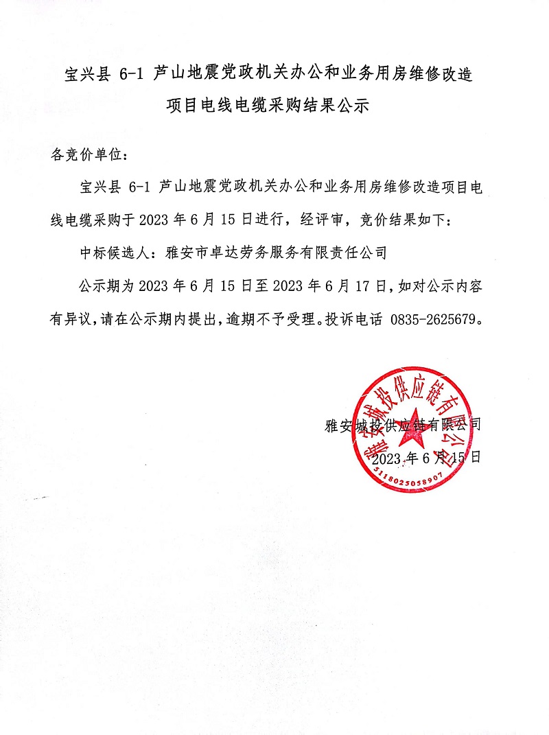 寶興縣 6-1 蘆山地震黨政機關(guān)辦公和業(yè)務用房維修改造項目電線電纜采購結(jié)果公示
