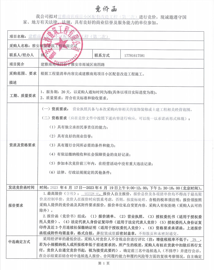 建雅南苑項目小區(qū)配套改造工程(第二次)競價公告