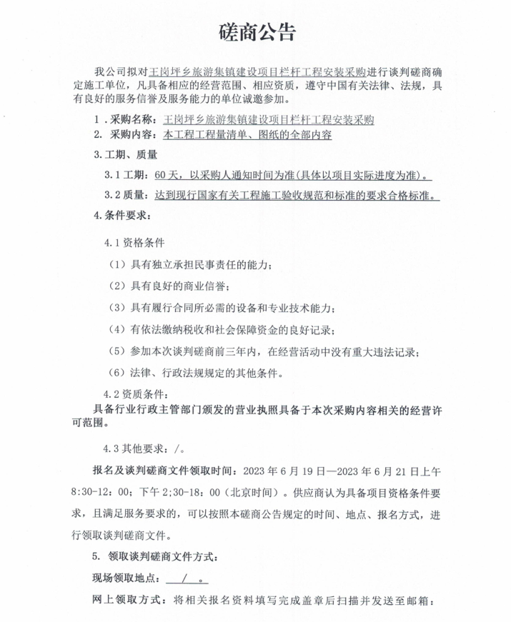 王崗坪鄉(xiāng)旅游集鎮(zhèn)建設(shè)項(xiàng)目欄桿工程安裝采購談判磋商公告
