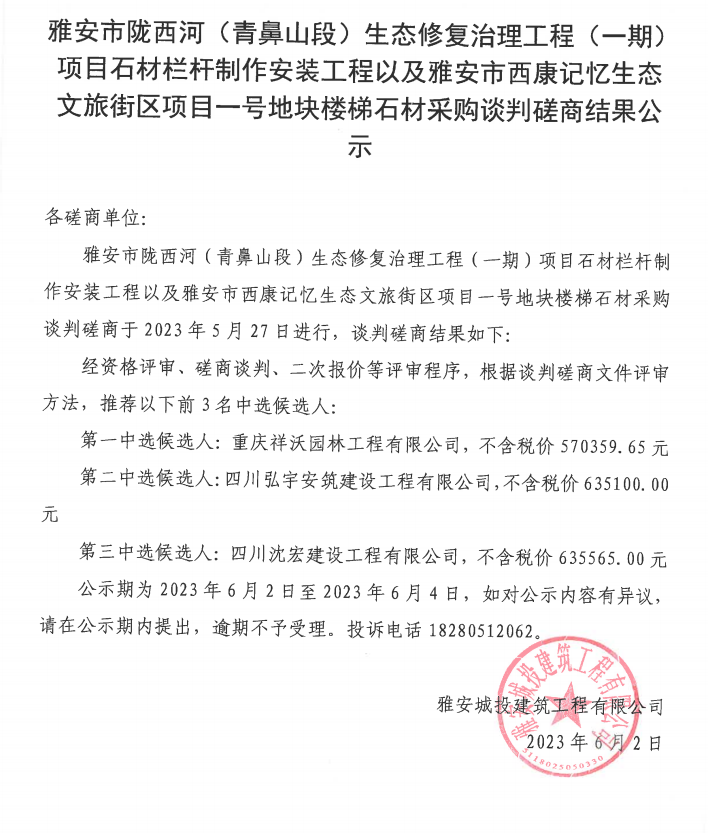 雅安市隴西河(青鼻山段)生態(tài)修復(fù)治理工程(一期)項(xiàng)目石材欄桿制作安裝工程以及雅安市西康記憶生態(tài)文旅街區(qū)項(xiàng)目一號(hào)地塊樓梯石材采購談判磋商結(jié)果公示