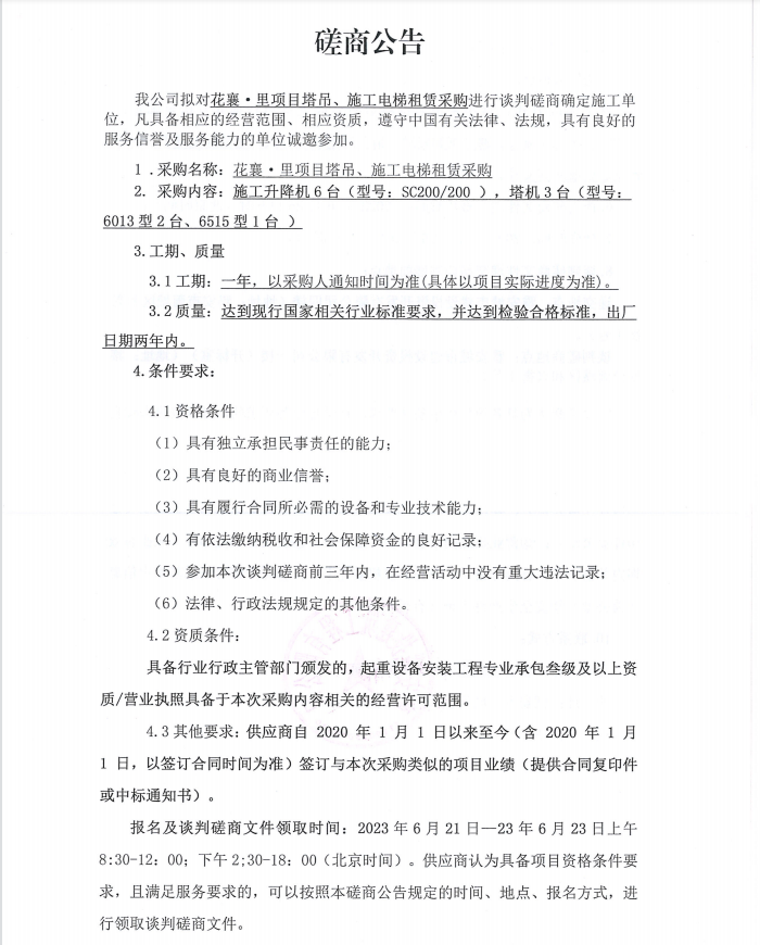 花襄·里項(xiàng)目塔吊、施工電梯租賃采購談判磋商公告