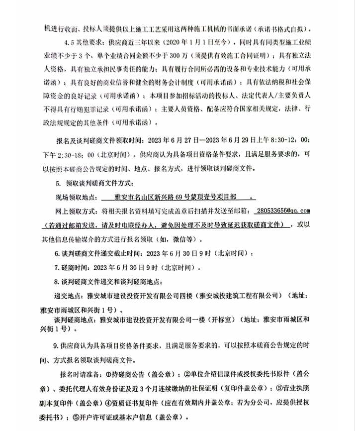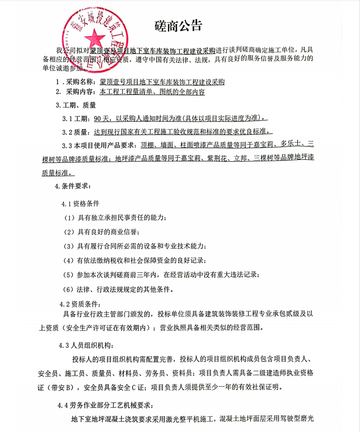 蒙頂壹號項目地下室車庫裝飾工程建設(shè)采購談判磋商公告