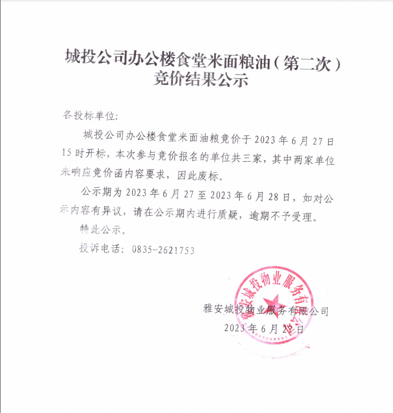 城投公司辦公樓食堂米面糧油(第二次)競價結(jié)果公示