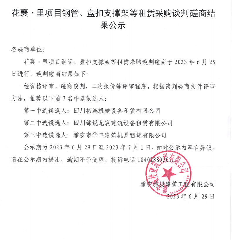花襄·里項(xiàng)目鋼管、盤(pán)扣支撐架等租賃采購(gòu)談判磋商結(jié)果公示