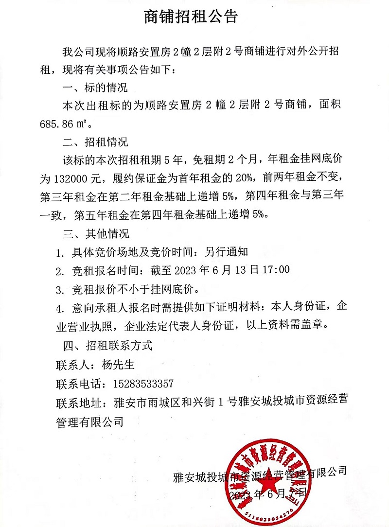 順路安置房2幢2層附2號(hào)商鋪招租公告