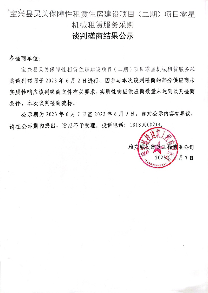 寶興縣靈關保障性租賃住房建設項目(二期)項目零星機械租賃服務采購談判磋商結果公示