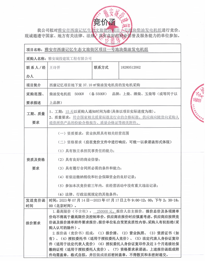 雅安市西康記憶生態(tài)文旅街區(qū)項目一號地塊柴油發(fā)電機組競價采購公告