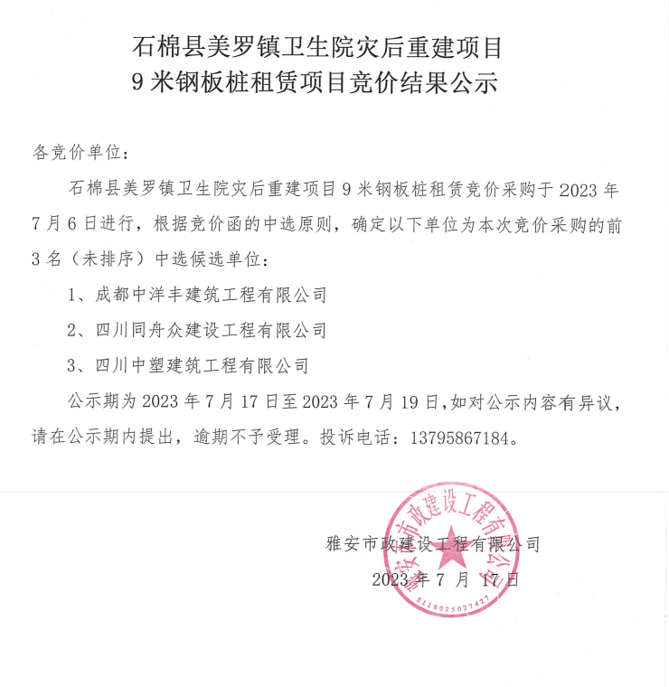 石棉縣美羅鎮(zhèn)衛(wèi)生院災(zāi)后重建項(xiàng)目9米鋼板樁租賃項(xiàng)目競(jìng)價(jià)結(jié)果公示