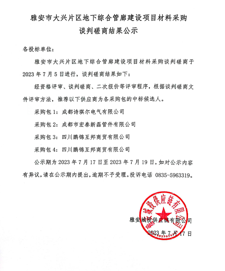 雅安市大興片區(qū)地下綜合管廊建設項目材料采購談判磋商結果公示