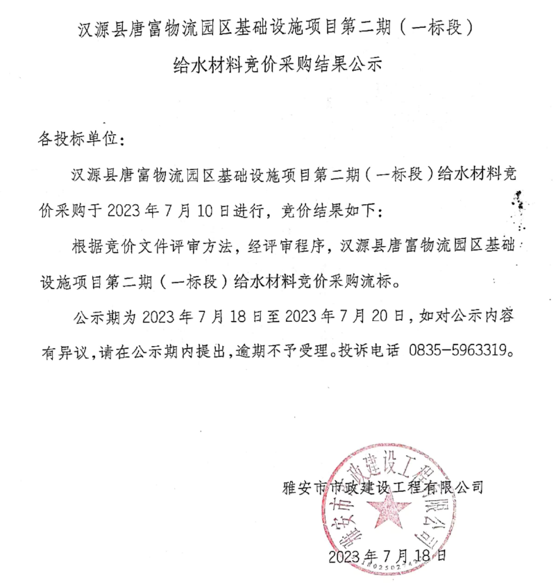 漢源縣唐富物流園區(qū)基礎設施項目二期(一標段)給水材料競價采購結(jié)果公示