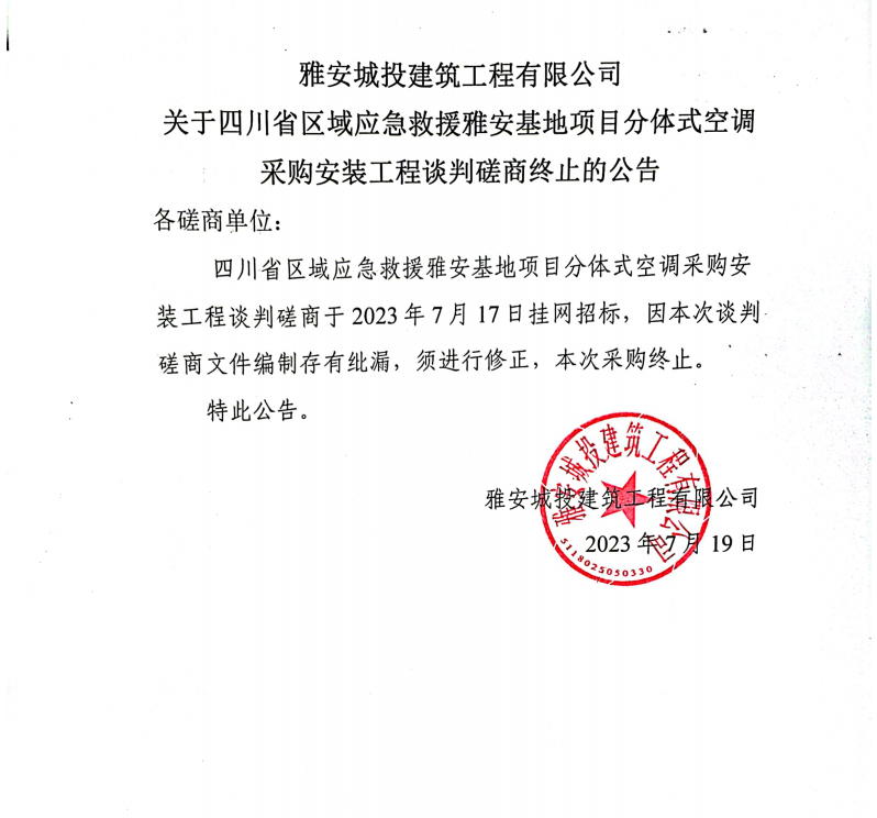 雅安城投建筑工程有限公司關(guān)于四川省區(qū)域應(yīng)急救援雅安基地項(xiàng)目分體式空調(diào)采購安裝工程談判磋商終止的公告