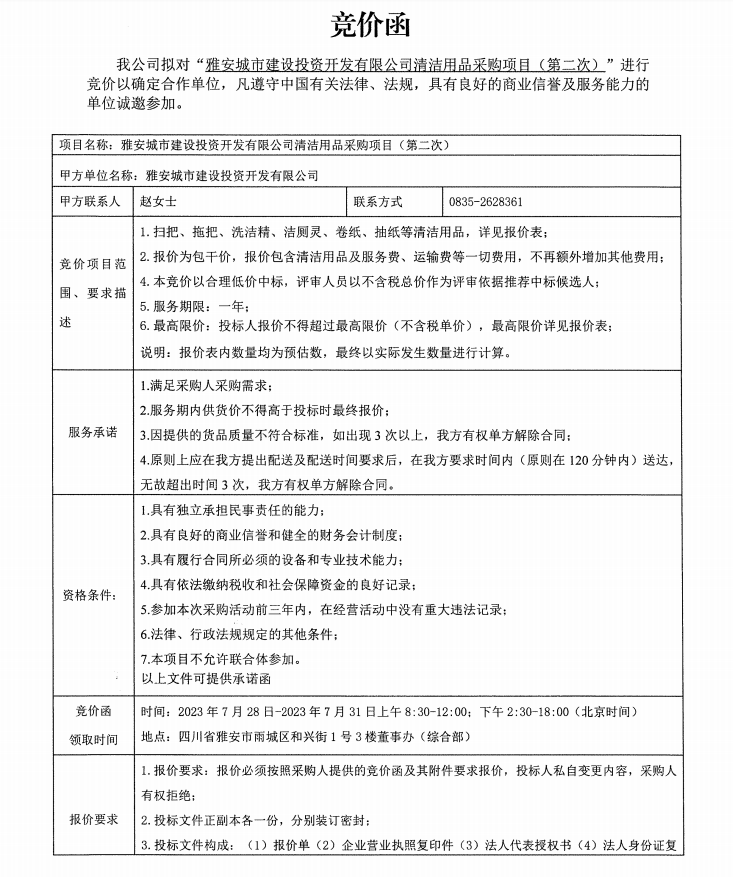 雅安城市建設(shè)投資開發(fā)有限公司清潔用品采購項目(第二次)競價公告