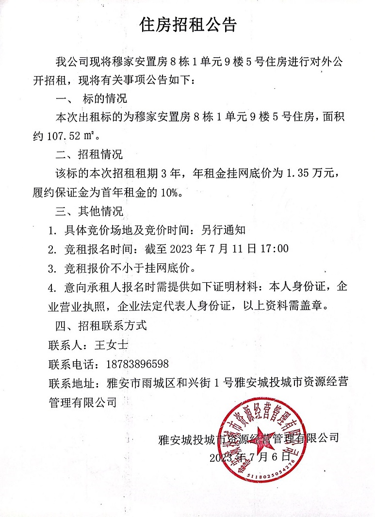穆家安置房8棟1單元9樓5號(hào)住房招租公告