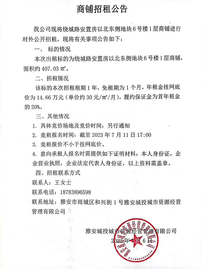 繞城路安置房以北東側(cè)地塊6號樓1層商鋪招租公告