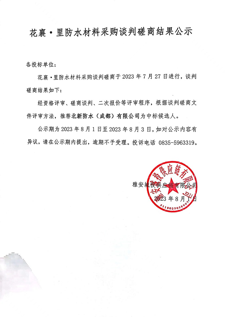花襄·里防水材料采購談判磋商結(jié)果公示
