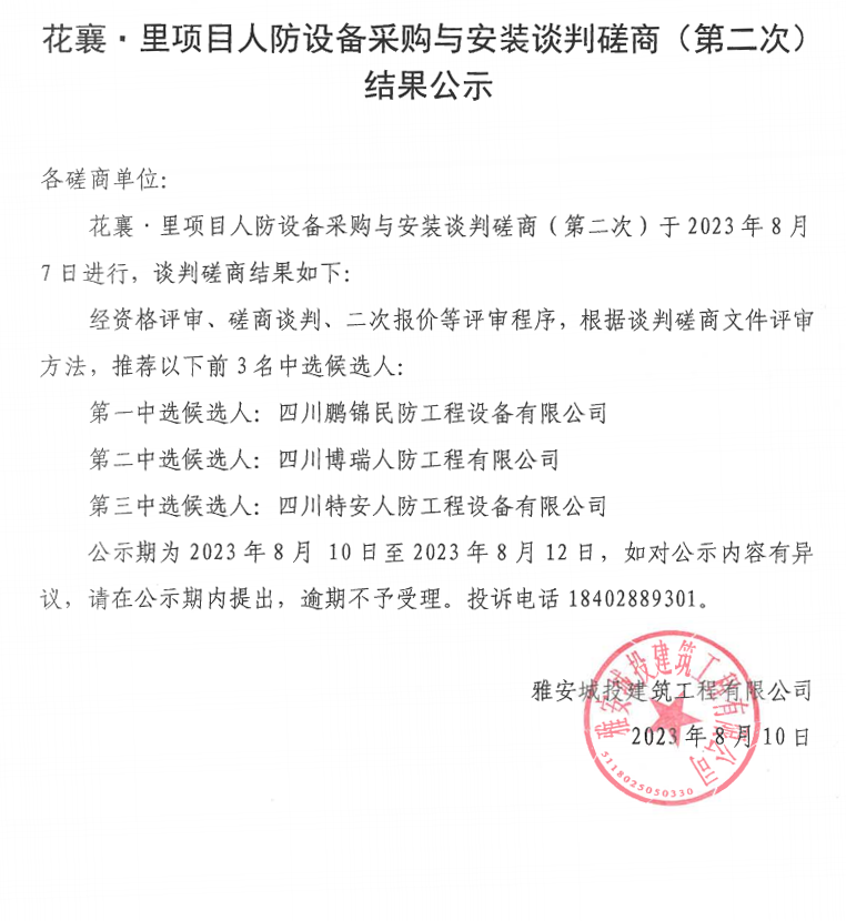 花襄·里項(xiàng)目人防設(shè)備采購(gòu)與安裝談判磋商(第二次)結(jié)果公示