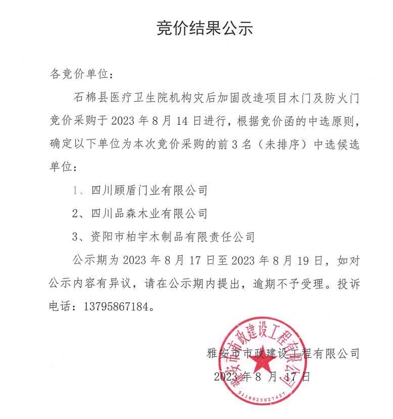 石棉縣醫(yī)療衛(wèi)生院機(jī)構(gòu)災(zāi)后加固改造項(xiàng)目木門(mén)及防火門(mén)競(jìng)價(jià)采購(gòu)結(jié)果公示