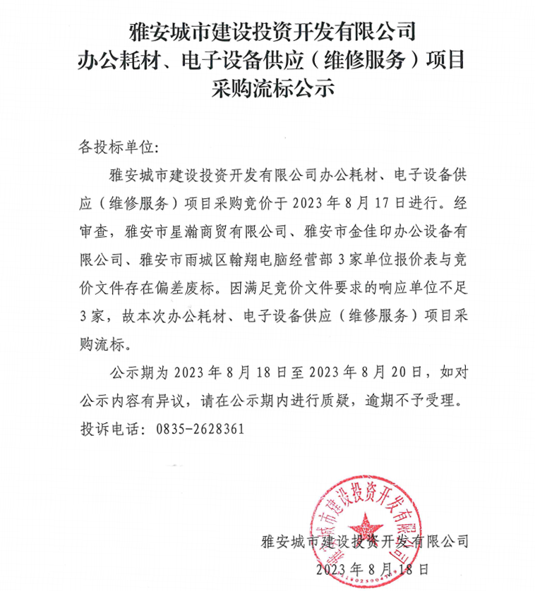 雅安城市建設(shè)投資開發(fā)有限公司辦公耗材、電子設(shè)備供應(yīng)(維修服務(wù))項目采購流標公示