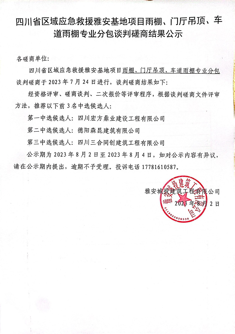 四川省區(qū)域應(yīng)急救援雅安基地項(xiàng)目雨棚、門(mén)廳吊頂、車(chē)道雨棚專(zhuān)業(yè)分包談判磋商結(jié)果公示