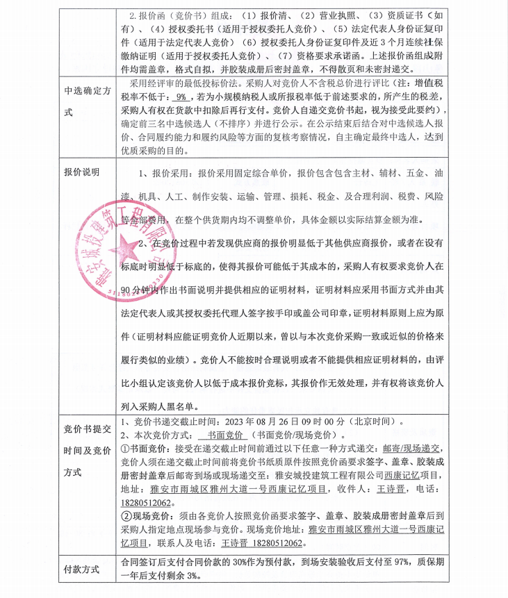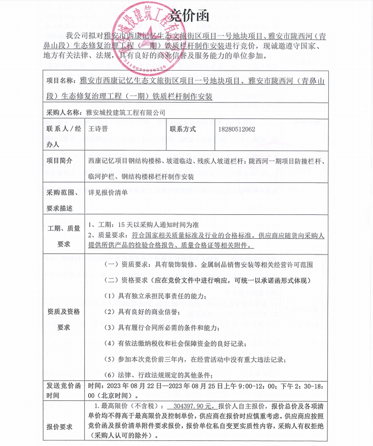 雅安市西康記憶生態(tài)文旅街區(qū)項目一號地塊項目、雅安市隴西河(青鼻山段)生態(tài)修復治理工程(一期)鐵質欄桿制作安裝競價公告