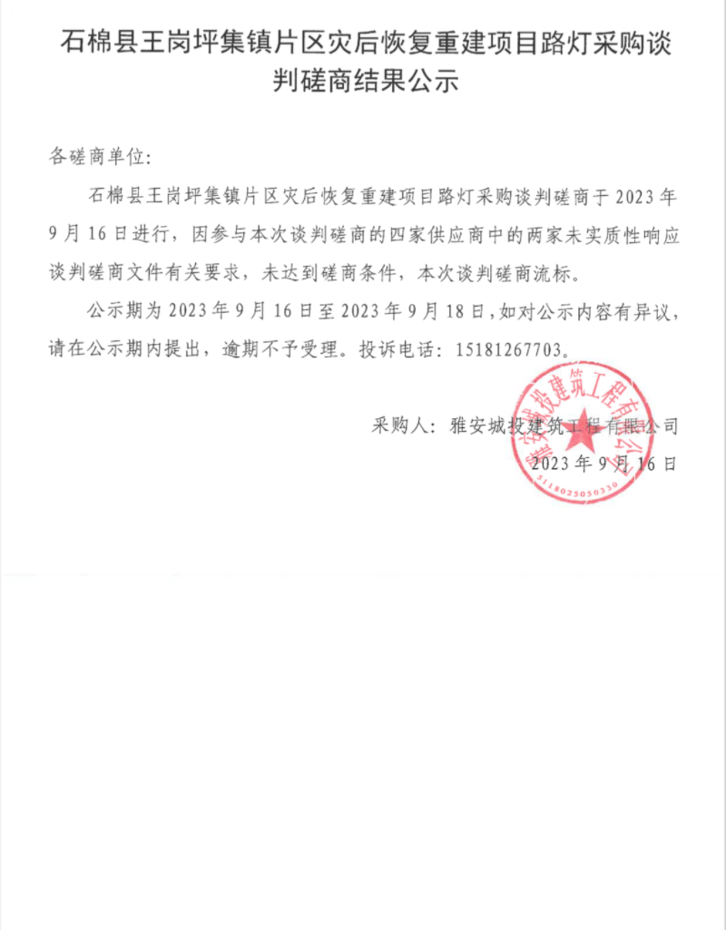 石棉縣王崗坪集鎮(zhèn)片區(qū)災(zāi)后恢復(fù)重建項目路燈采購談判磋商結(jié)果公示