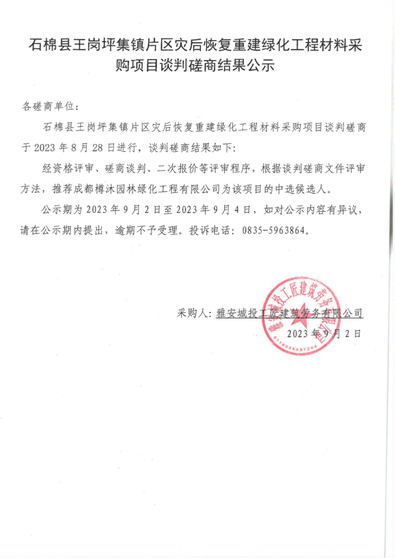 石棉縣王崗坪集鎮(zhèn)片區(qū)災(zāi)后恢復(fù)重建綠化工程材料采購項目談判磋商結(jié)果公示