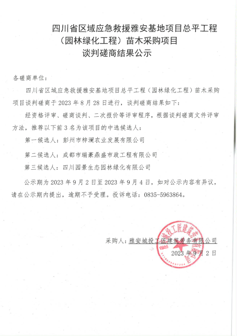四川省區(qū)域應急救援雅安基地項目總平工程(園林綠化工程)苗木采購項目談判磋商結(jié)果公示