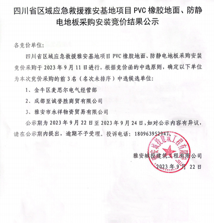 四川省區(qū)域應(yīng)急救援雅安基地項(xiàng)目PVC橡膠地面、防靜電地板采購(gòu)安裝競(jìng)價(jià)結(jié)果公示