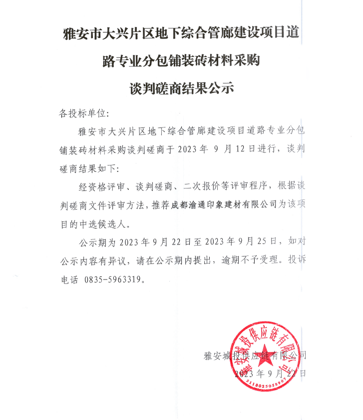 雅安市大興片區(qū)地下綜合管廊建設(shè)項(xiàng)目道路專業(yè)分包鋪裝磚材料采購(gòu)談判磋商結(jié)果公示