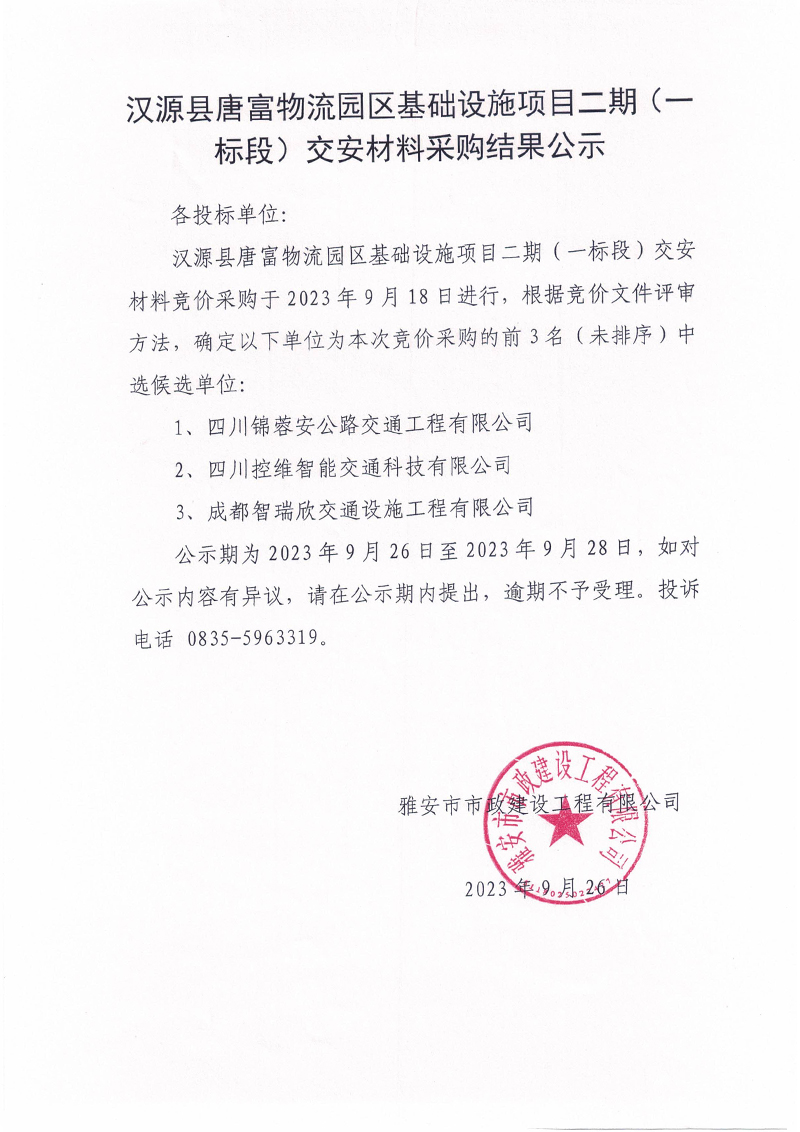 漢源縣唐富物流園區(qū)基礎(chǔ)設(shè)施項目二期(一標段)交安材料采購結(jié)果公示