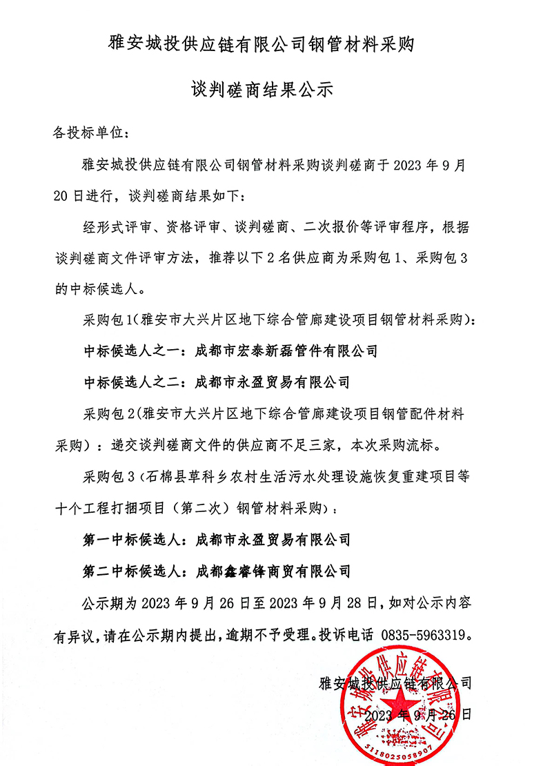 雅安城投供應鏈有限公司鋼管材料采購談判磋商結(jié)果公示