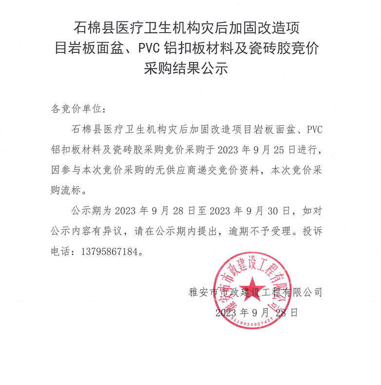 石棉縣醫(yī)療衛(wèi)生機(jī)構(gòu)災(zāi)后加固改造項(xiàng)目巖板面盆、PVC鋁扣板材料及瓷磚膠競(jìng)價(jià)采購結(jié)果公示